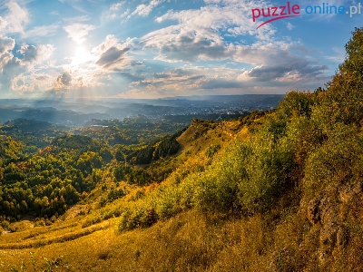 Las, Promienie słońca, Rosja, Chmury, Wzgórza, Roślinność, Kisłowodzki Park Narodowy