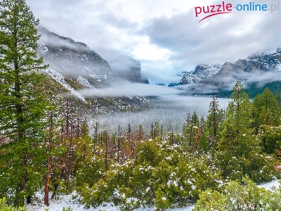 Śnieg, Stany Zjednoczone, Park Narodowy Yosemite, Drzewa, Chmury, Góry Sierra Nevada, Mgła, Kalifornia