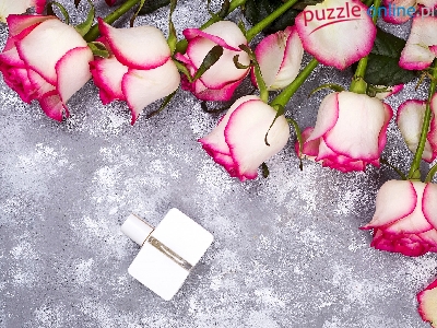 Perfumy, Biało-różowe, Tło, Róże, Buteleczka, Szare