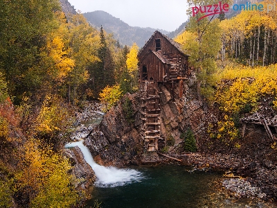 Las, Kryształowy Młyn, Rzeka Crystal River, Jesień, Stany Zjednoczone, Góry, Młyn Crystal Mill, Drzewa, Stan Kolorado