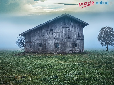 Szopa, Drzewa, Niebo, Pole, Drewniana, Łąka, Mgła