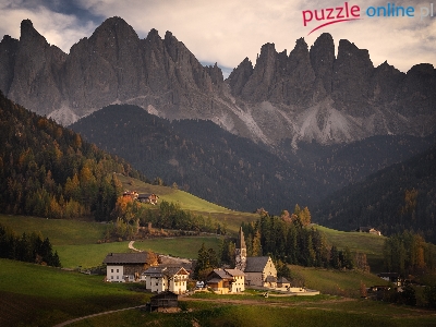 Las, Domy, Wieś, Masyw Odle, Włochy, Góry, Dolina Val di Funes, Kościół, Dolomity, Drzewa, Santa Maddalena