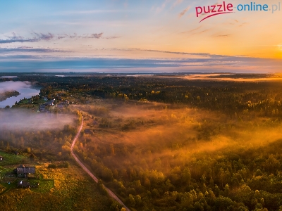 Las, Park przyrody Vepsskiy Les, Mgła, Wschód słońca, Rosja, Droga, Jezioro Ladvinskoye, Domy, Obwód leningradzki
