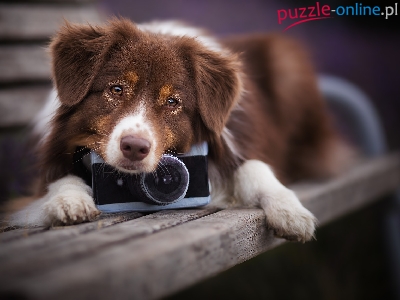 Puzzle Aparat fotograficzny, Pies, Owczarek australijski, Ławka