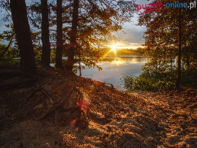 Puzzle Świt, Drzewa, Jezioro, Wschód słońca