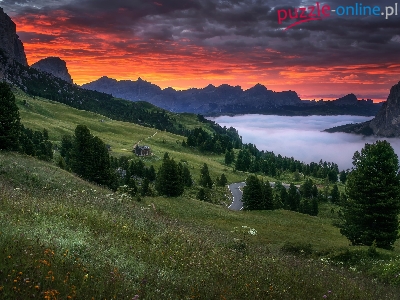 Droga, Mgła, Drzewa, Góry, Wzgórze, Zachód słońca