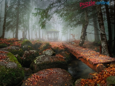 Rzeka, Las, Kładka, Liście, Altanka, Kamienie, Park, Omszałe, Mgła