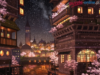 Kwitnące, Grafika, Domy, Miasto, Gałązki