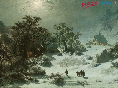 Malarstwo, Drzewa, Domy, Adolf Kosarek, Åšnieg, Obraz, Zima, Postacie