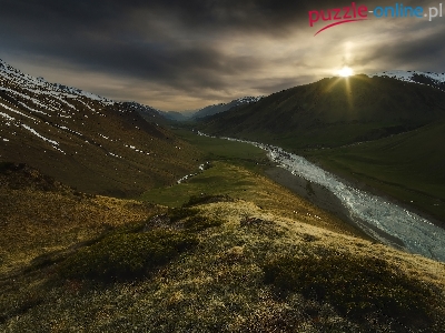 Promienie słońca, Kirgistan, Góry Tienszan, Chmury, Rzeka Chon-Kemin