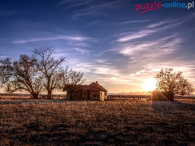 Stary, Drzewa, Wschód słońca, Dom, Pole, Drewniany, Poranek