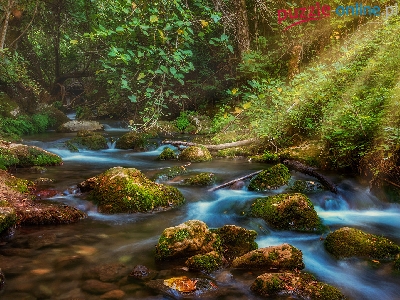 Omszałe, Drzewa, Przebijające światło, Las, Rzeka, Kamienie, Roślinność