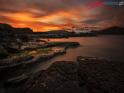 Latarnia morska Cromwell Point, Wyspa Valentia, Irlandia, Zachód słońca, Morze, Skały, Hrabstwo Kerry