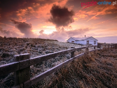 Łąka, Chmury, Ogrodzenie, Zachód słońca, Dom, Szron