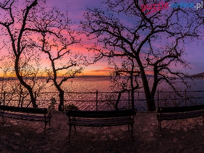 Zatoka Kvarner, Zachód słońca, Chorwacja, Ławki, Jezioro, Drzewa, Opatija