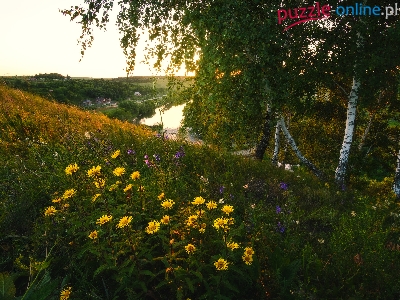 Kwiaty, Żółte, Wzgórze, Rzeka Krasivaya Mecha, Rosja, Brzozy, Lato, Drzewa, Obwód tulski