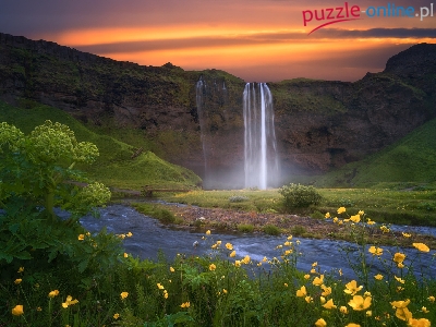 Skały, Żółte, Islandia, Niebo, Wodospad Seljalandsfoss, Rzeka Seljalandsa, Kwiaty