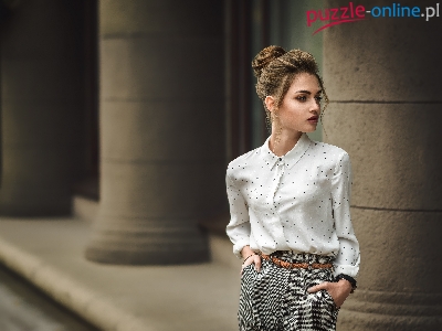 Włosy, Spodnie, Dziewczyna, Upięte, Bluzka