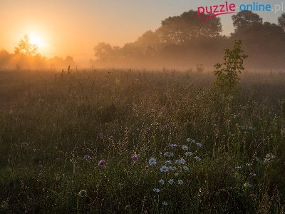 Wschód słońca, Drzewa, Łąka, Mgła, Kwiaty