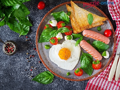 Bazylia, Parówki, Ścierka, Jajko sadzone, Sztućce, Kromki, Serca, Śniadanie, Chleb, Pomidory