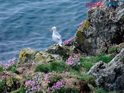 Kwiaty, Trawa, Mewa, Morze, Skała, Ptak