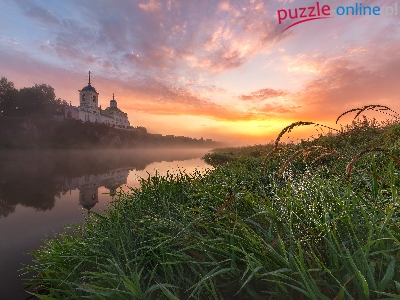 Mgła, Cerkiew, Pajęczyna, Rzeka, Wschód słońca, Trawy