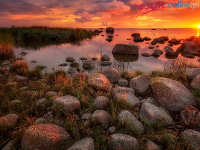 Puzzle Trawa, Morze, Kamienie, Zachód słońca