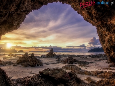 Zachód słońca, Prowincja Ranong, Tajlandia, Morze Andamańskie, Jaskinia, Plaża Kao Kwai, Wyspa Koh Phayam