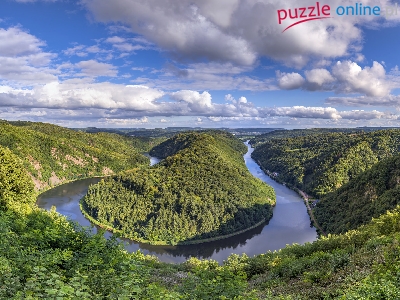 Wzgórza, Zalesione, Zakole, Meandro del Sarre, Niemcy, Chmury, Rzeka Saara, Drzewa, Mettlach