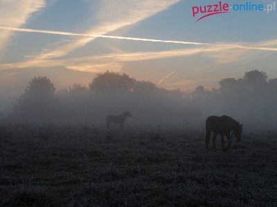 Puzzle Łąka, Mgła, Konie, Drzewa