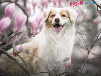 Puzzle Kwiaty, Pies, Owczarek australijski, Magnolie