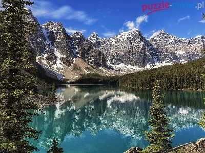Park Narodowy Banff, Alberta, Drzewa, Góry, Odbicie, Las, Kanada, Jezioro Moraine, Chmury