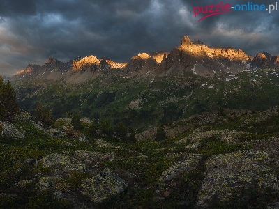 Alpy, Pochmurne, Francja, Szczyty, Góry, Rozświetlone, Niebo