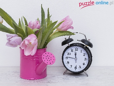 Różowe, Budzik, Konewka, Bukiet, Tulipany