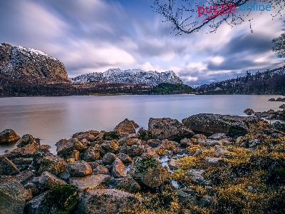 Jezioro Hofreistae, Norwegia, Miejscowość Bjerkreim, Kamienie, Niebo, Góry, Skały, Rogaland