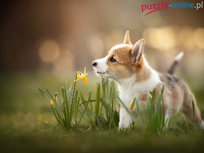Welsh corgi pembroke, Narcyz żonkil, Pies, Szczeniak, Kwiaty