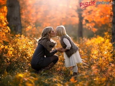 Dziewczynka, Las, Jesień, Kobieta, Pocałunek