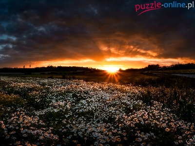 Łąka, Ciemne, Rumianek, Zachód słońca, Chmury, Kwiaty