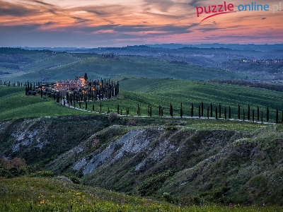 Toskania, Domy, Droga, Wzgórza, Włochy, Zachód słońca, Drzewa
