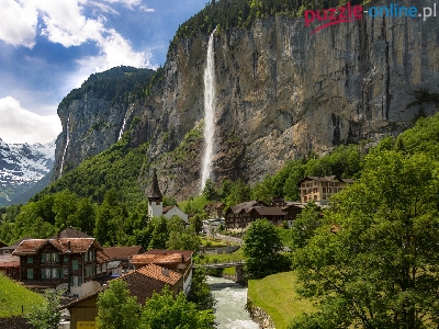 Rzeka Lutschine, Droga, Kościół, Wodospad Staubbach, Szwajcaria, Dolina Lauterbrunnental, Kanton Berno, Drzewa, Góry, Domy, Gmina Lauterbrunnen