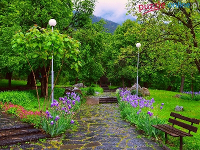 Alejki, Drzewa, Latarnie, Park, Ławka, Irysy