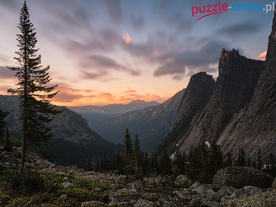 Świerki, Wschód słońca, Góry, Skały, Kamienie