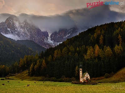 Góry, Kościół św. Jana, Włochy, Dolina Val di Funes, Lasy, Dolomity