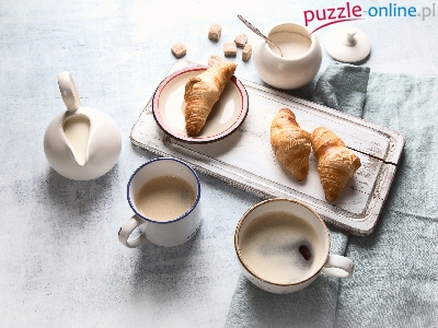 Rogaliki, Dzbanuszek, Deska, Croissanty, Kompozycja, Śniadanie, Kubek, Serwetka, Kawa, Cukierniczka, Filiżanka