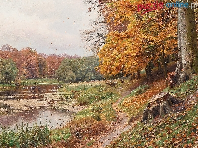 Pejzaż, Jezioro, Ścieżka, Las, Sarny, Malarstwo, Peder Mork Monsted, Jesień, Obraz, Drzewa