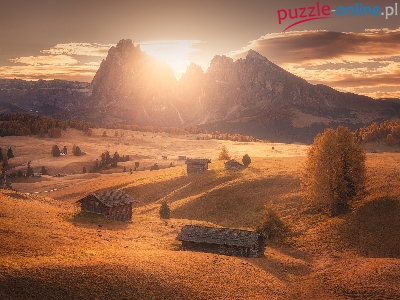 Góry Sassolungo, Dolina Val Gardena, Wschód słońca, Domy, Włochy, Wzgórza, Płaskowyż Seiser Alm, Dolomity, Drzewa