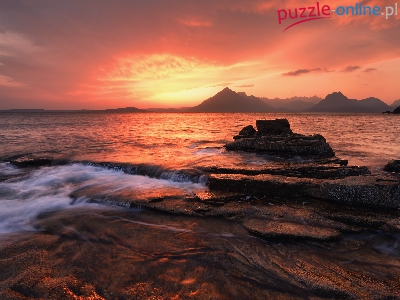 Skały, Szkocja, Wieś Elgol, Zachód słońca, Morze, Góry, Wyspa Skye