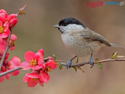 Ptak, Czerwone, Sikora uboga, Gałązka, Kwiaty, Sikorka
