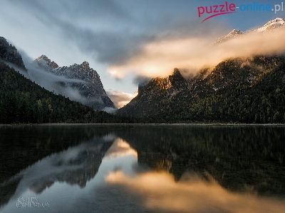 Drzewa, Dolomity, Chmury, Odbicie, Włochy, Lago di Dobbiaco, Góry, Jezioro Toblacher See, Prowincja Bolzano