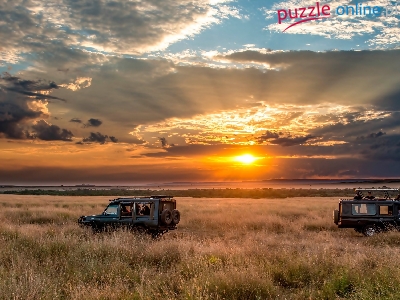 Safari, Samochody, Pole, Afryka, Zachód słońca